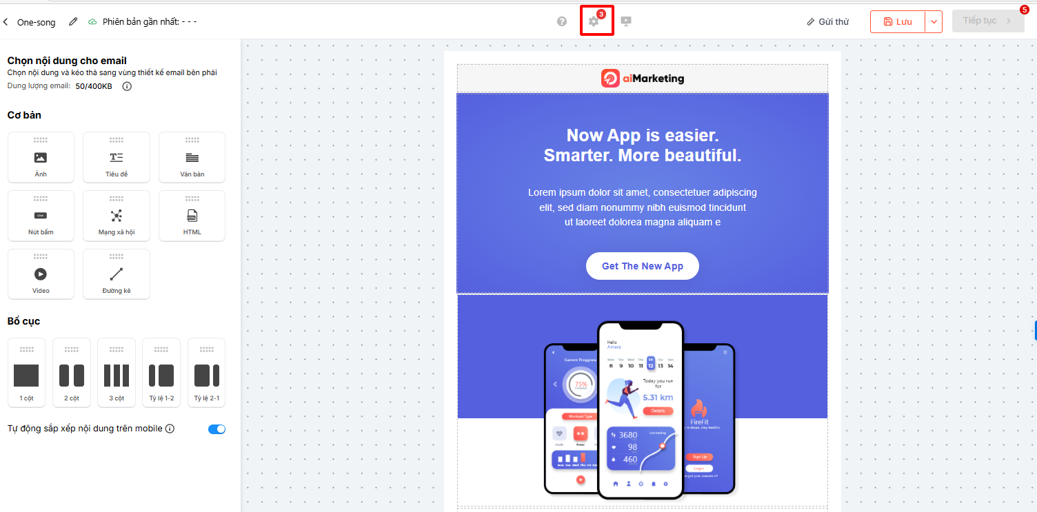 Bước 3: Tại giao diện thiết kế và chỉnh sửa email nhấn biểu tượng bánh răng phía trên
