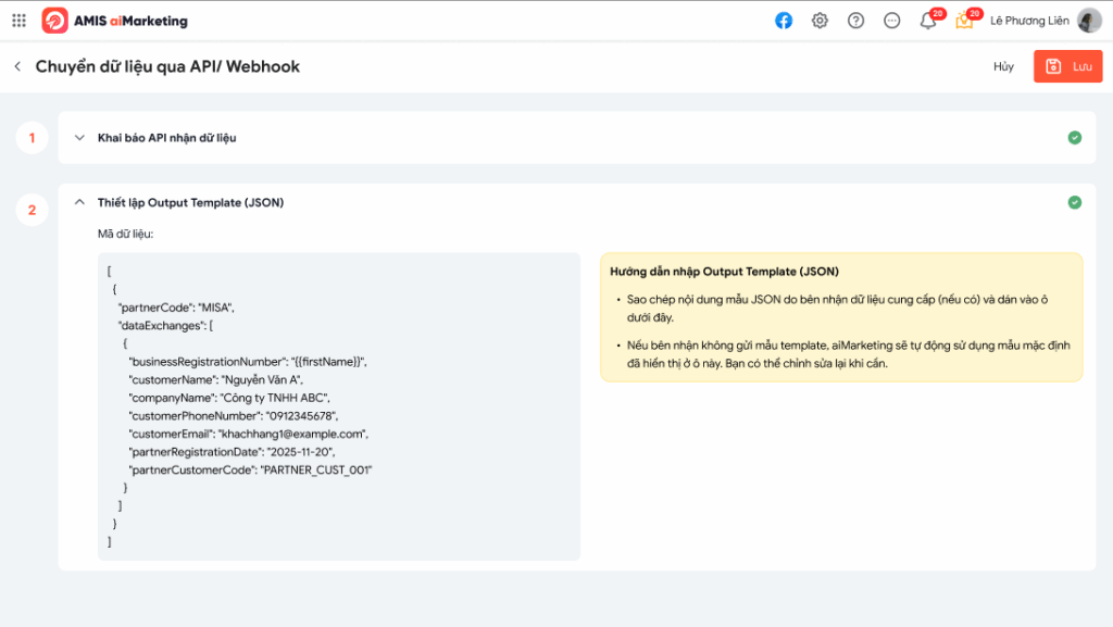 - Nhập mẫu Output Template (JSON) đúng cấu trúc mà bên nhận dữ liệu yêu cầu. Template này xác định định dạng và nội dung dữ liệu aiMarketing sẽ truyền sang hệ thống ngoài.