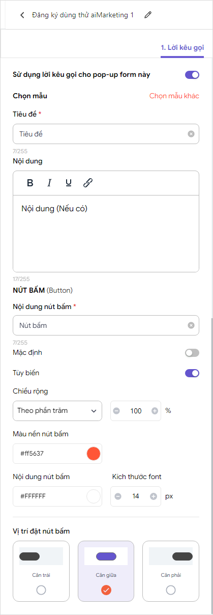 • Tiêu đề: Nhập tiêu đề cho Lời kêu gọi. Tiêu đề này được sử dụng chung cho Form pop-up.