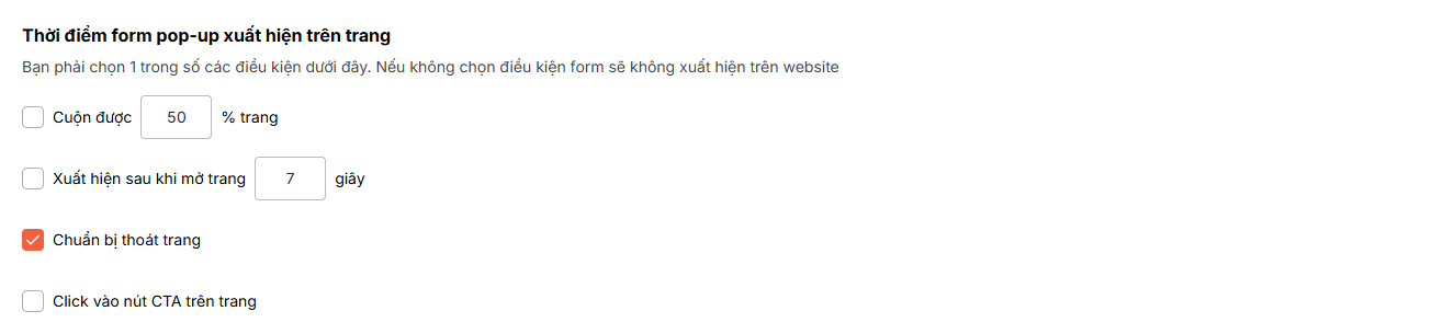 • Cuộn được …% trang: Form pop-up sẽ xuất hiện khi người truy cập đã cuộn được số phần trăm trang mà bạn đã thiết lập