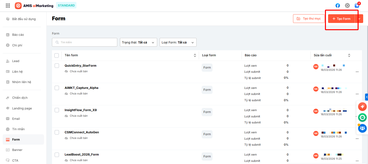 Bước 1: Trên AMIS aiMarketing \ vào phân hệ Form \ nhấn Tạo Form