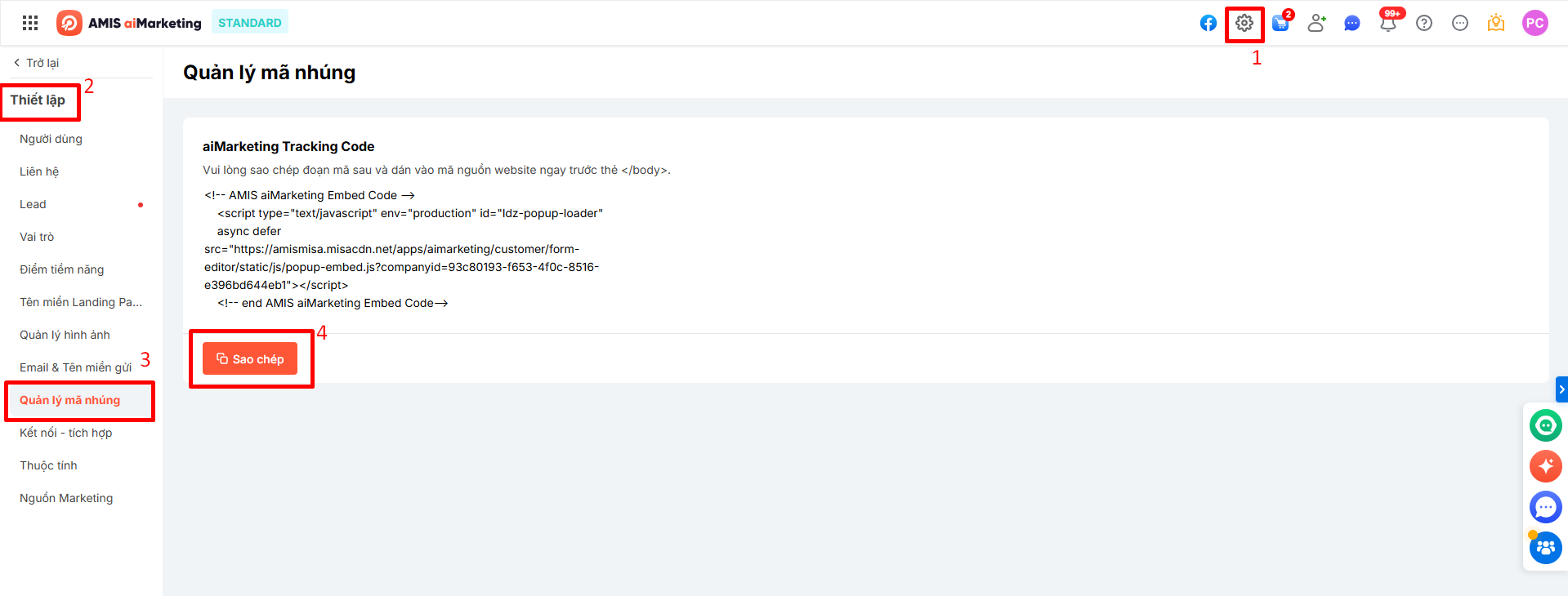 Bước 1. Trên giao diện chương trình, nhấn vào biểu tượng bánh răng Thiết lập \ tab Thiết lập \ Quãn lý mã nhúng \ chọn Sao chép.